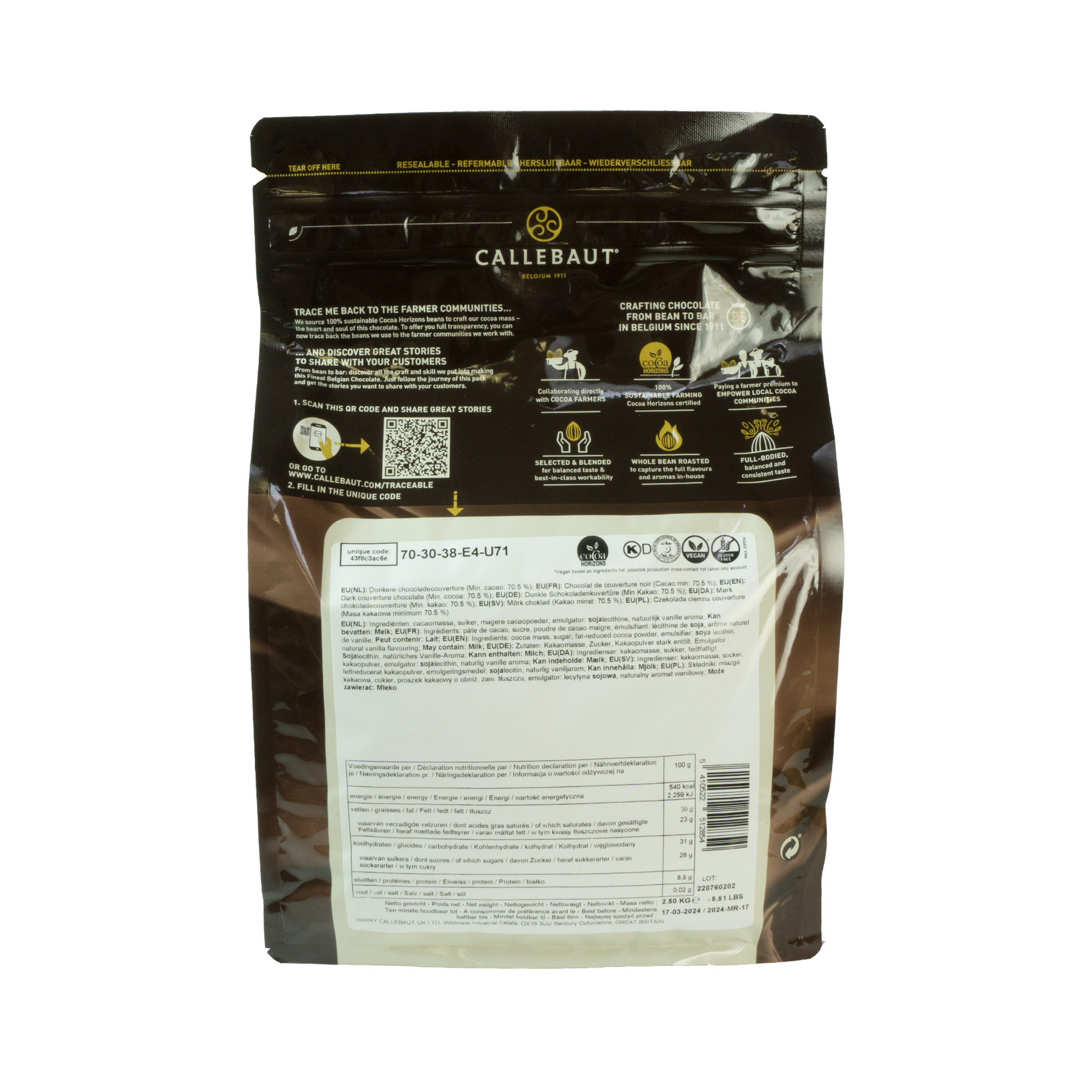• Callebaut since 1911. Finest Belgian Chocolate (70.0% cacao) made from fine cocoa beans, To achieve a perfectly balanced and round taste, we blend cocoa beans from 3 different countries of origin: Ivory Coast, Ghana and Ecuador.