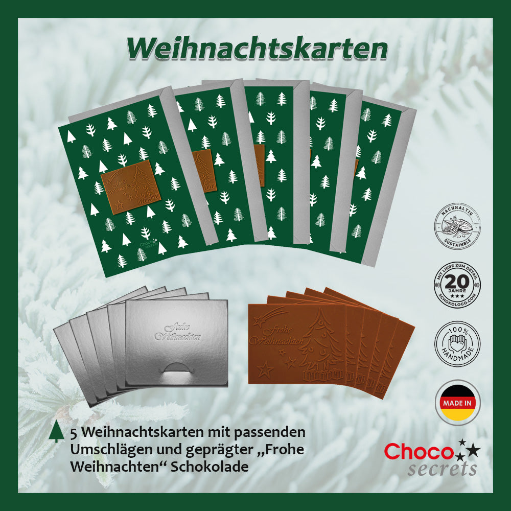 Christmas cards with embossed chocolate in a silver box, set of 5, card design: green with trees, embossed chocolate: "Frohe Weihnachten", envelope in silver