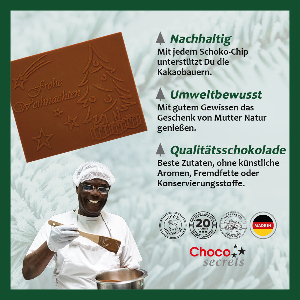 Chocolate packed in a golden gift box with the embossing "Frohe Weihnachten".