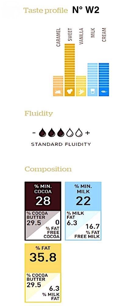 Recipe N° W2 is another one of Octaaf Callebaut's original recipes that has grown into many chefs' preferred chocolate. This chocolate is as Belgian as can be, since it's predominately made with milk from cows grazing on Belgian pastures and sugar from locally grown sugar beets.